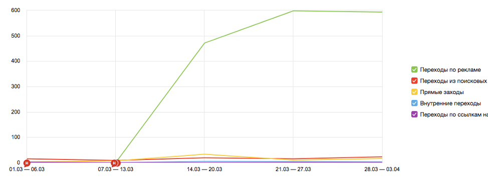 В первую неделю после запуска рекламных кампаний мы получили 470 кликов, затем количество кликов достигло 600 в неделю. Уверенно удерживаем позиции в заданном месячном бюджете