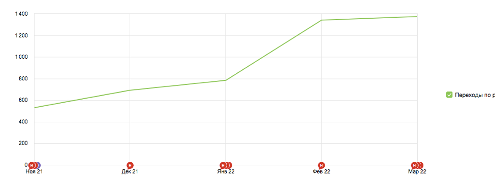 После запуска рекламных кампаний сразу же в первый месяц получили порядка 690 кликов, затем, в результате оптимизации, количество посетителей росло и за март достигло отметки 1370 кликов за месяц