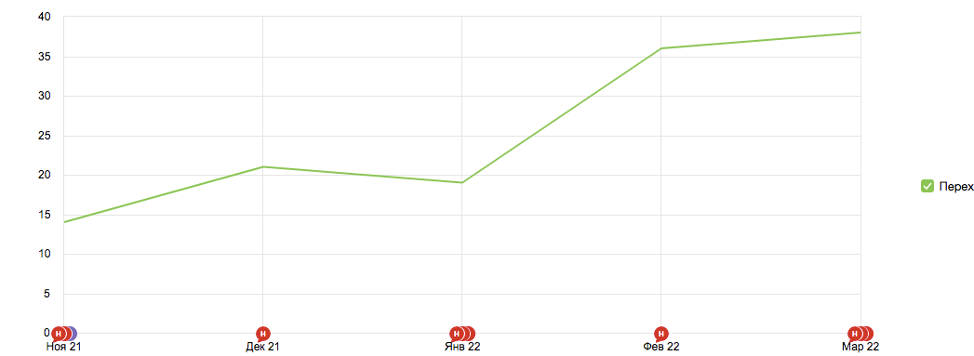 За первый месяц после запуска РК мы получили около 20 конверсий-обращений (чат, телефон, заказ звонка, переход в мессенджер), затем увеличение плавно продолжилось и в марте составило 38 конверсий