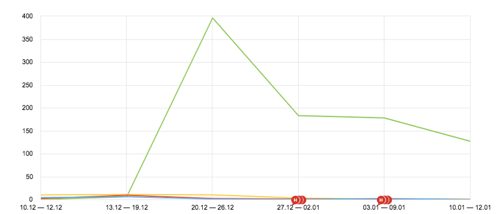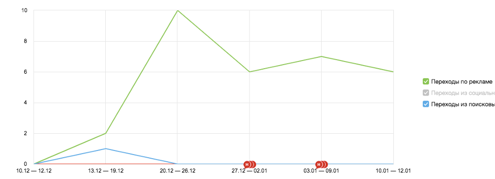 За первые 3 дня после запуска рекламной кампании мы получили 11 кликов, затем следующую неделю количество кликов резко выросло до 400, что показало интерес выбранной аудитории к данной услуге. В дальнейшем мы получали около 180 кликов в неделю, несмотря на новогодние праздники