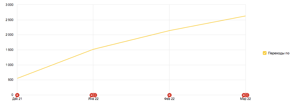 На момент начала работы количество кликов составляло около 550 в месяц. За первый же месяц мы увеличили количество кликов в 3 раза, до 1518 в месяц. В дальнейшем, в результате оптимизации, рост кликов неуклонно продолжался. На данный момент он составляет 2600 кликов в месяц
