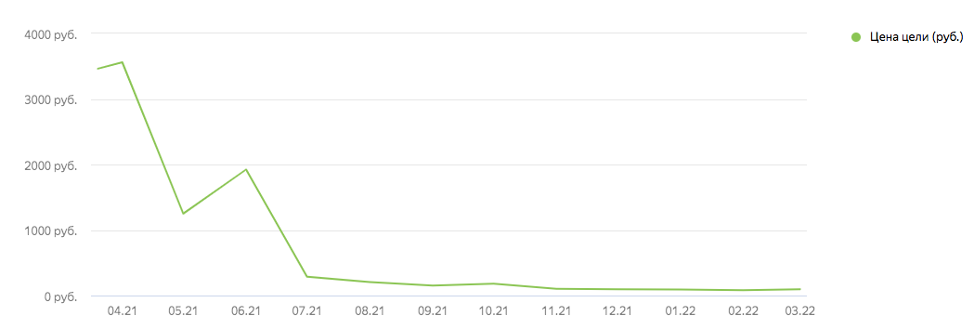 Стоимость конверсии на начало работы составляла 3500, коррекцией и оптимизацией мы постепенно снижали стоимость и через 4 месяца вышли на прекрасный результат 280 рублей, снизив стоимость в 12 раз!