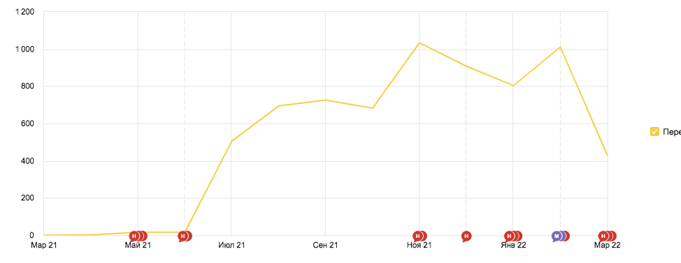 Количество конверсий в первые 2 месяц нас не радовали, но уже в июле 2021 получили 506 конверсий (это и переходы в чаты, звонки в колл центр, заполнение анкет, отправка заявок), что в 36 раз превышало первоначальное количество. Затем конверсии продолжили уверенный рост и к ноябрю 2021 года достигли 1036 в месяц. Пережив праздники, количество конверсий продолжило удерживать эту планку