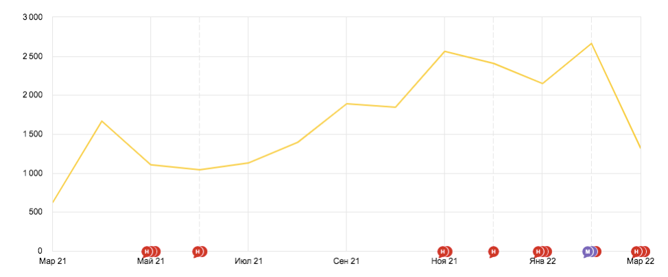 В первый месяц повысили количество кликов с 500 до 1700 , затем в течение года, оптимизировали РК и внедряли новые инструменты. Самых высоких показателей по кликам добились в ноябре 2021 года – 2561 в месяц, затем был спад на длительный праздничный период, потом опять подъем до близких цифр.