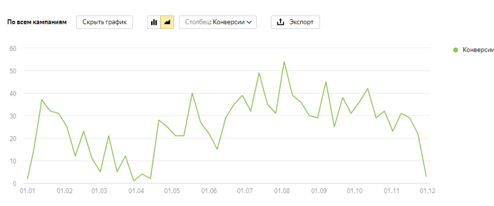 За первый месяц после перезапуска РК мы получили около 10-14 конверсий в неделю, затем увеличение плавно продолжилось и в следующие месяцы составило от 25 до 35 конверсий в неделю